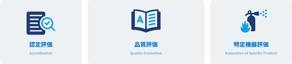 Quality evaluation is commissioned evaluation work related to machinery and equipment provided for fire-fighting purposes based on various standards on request, and evaluates fire-fighting equipment including tools and equipment requiring voluntary indication.
