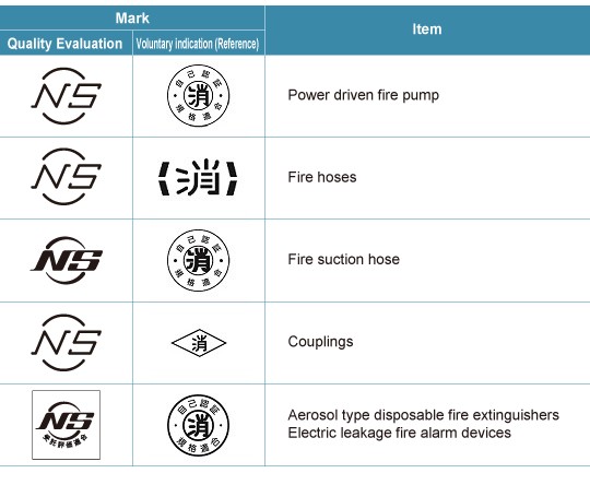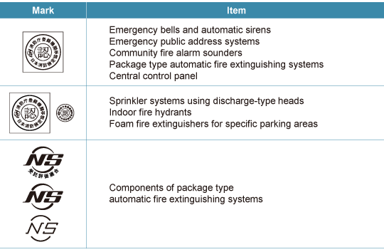 Fire equipment approved by the evaluation are indicated as such. Currently, evaluations are carried out for the following equipments: